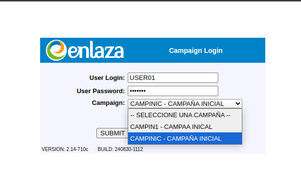 Como se visualizara en las siguientes dos imagenes, una vez colocando los datos del usuario, se nos mostrara las campañas a las que el usuario tenga acceso, seleccionaremos la campaña correspondinete y daremos en SUBMIT